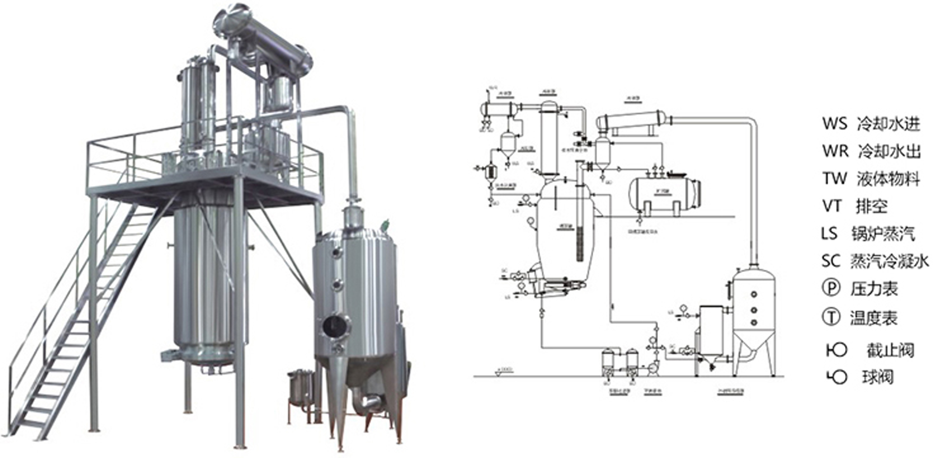 中的可溶性有效成份溶解于提取罐內(nèi)溶劑。提取液經(jīng)抽濾管抽入濃縮器、濃縮產(chǎn)生的二次蒸汽又送到提取罐作熱源和新溶劑,這樣形成的新